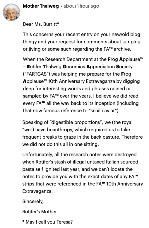 Who among you has read the entire "Frog Applause" archive? In other words, who has been hip to the jive and dived into the FA archive (and lived to tell?)